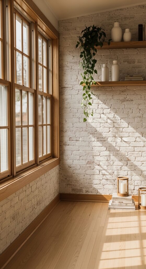 What makes it work: A whitewashed brick wall brings architectural texture into a sunroom without visual weight, reflecting light while still showing the natural dimensionality of the material beneath. It bridges the indoor and outdoor worlds in a way that smooth drywall simply cannot.