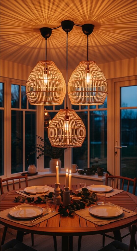 How to achieve it: Hang pendants at 30–34 inches above a table surface. For sunrooms with no ceiling junction box, plug-in pendant lights with a cord cover offer a hardwired look without electrical work. Look for rattan pendants from IKEA’s SINNERLIG range or similar affordable options.