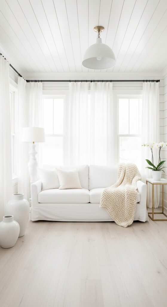 How to achieve it: Use warm white rather than cool white throughout — Benjamin Moore “Chantilly Lace” for walls and Sherwin-Williams “Alabaster” for trim creates a layered warmth. Keep floor color in bleached or pale oak tones to avoid the clinical coldness of very bright white wood.
