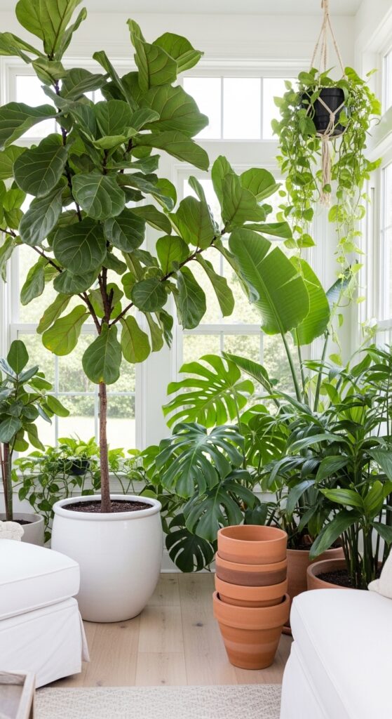How to achieve it: Cluster plants at three different heights — tall floor plants, medium shelf plants, and hanging ceiling plants — to create the layered density of a real garden. Fiddle-leaf figs, bird of paradise, and large areca palms all thrive in sunrooms with bright indirect light.