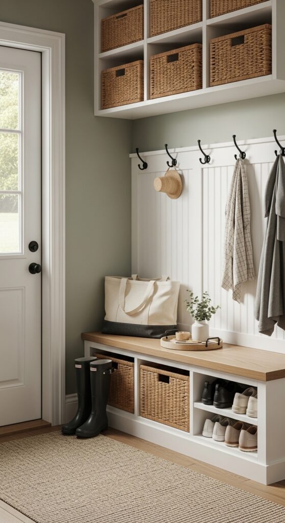 How to achieve it: Add a narrow bench, a row of sturdy hooks, and two or three wipeable baskets near the interior door. Use washable textiles and durable paint like satin warm white or muted sage.