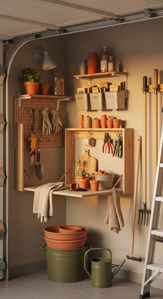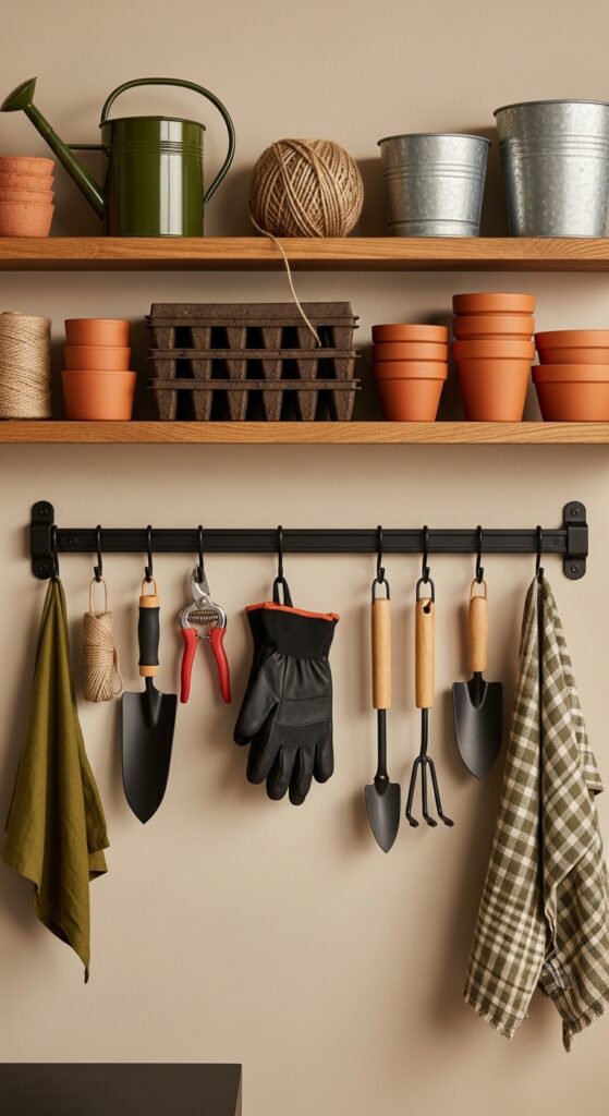 How to achieve it: Mount a folding bracket shelf near your garden tools, then add a peg rail or slim shelf above for seed packets, gloves, and pruners. Use galvanized bins to contain soil mess and small pots.