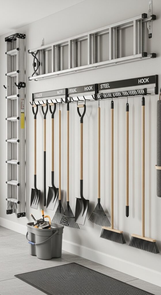 How to achieve it: Use stud-mounted ladder hooks plus a spring-grip tool rail for brooms, rakes, and shovels. Leave a little breathing room between handles so the grouping looks intentional, not crammed.