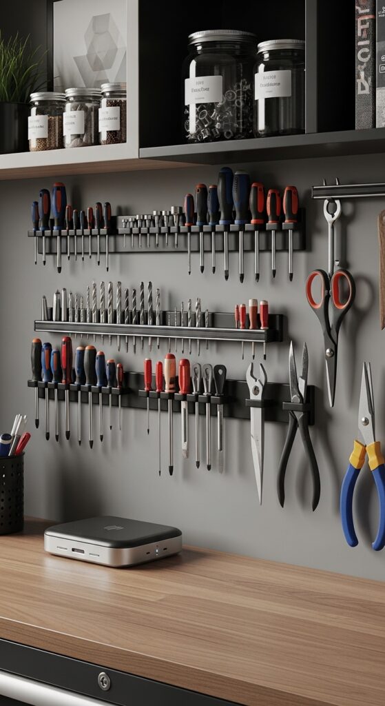 How to achieve it: Mount one or two heavy-duty magnetic bars near your main bench and dedicate them to the tools you reach for constantly. Keep similar items together—precision tools on one strip, screwdrivers on another.