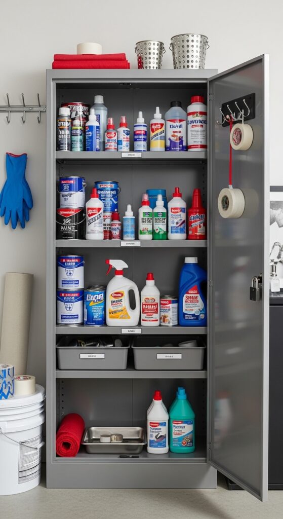How to achieve it: Use a lockable metal cabinet with a wipeable shelf liner or spill tray on the bottom. Sort by category—paint, adhesives, automotive fluids—and keep only products you actually use.