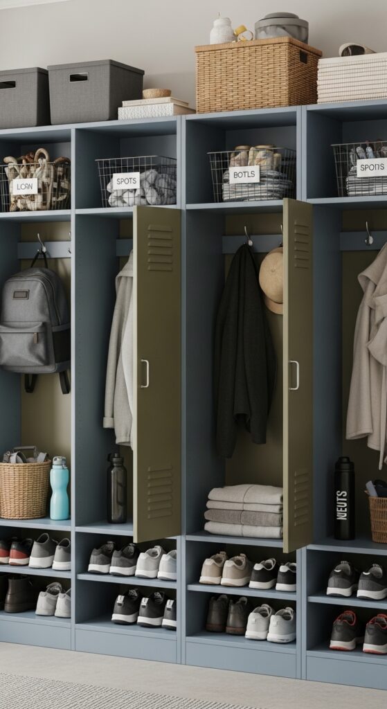 How to achieve it: Use narrow locker units or stacked cubbies painted in muted tones like dusty blue, olive, or warm white. Pair each section with a hook, upper bin, and easy-clean shoe tray.