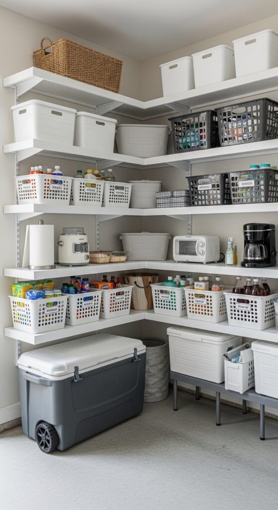 How to achieve it: Install wraparound shelves or an L-shaped shelving unit in an empty corner, then reserve it for lightweight overflow like paper goods, coolers, or picnic gear. Keep heavy items on lower levels only.