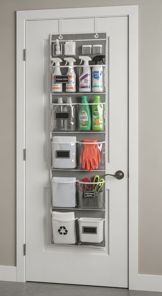How to achieve it: Hang a sturdy over-the-door organizer on a utility closet or side door and use it for gloves, polish cloths, bug spray, and spare funnels. Stick to small, light items so the profile stays tidy.