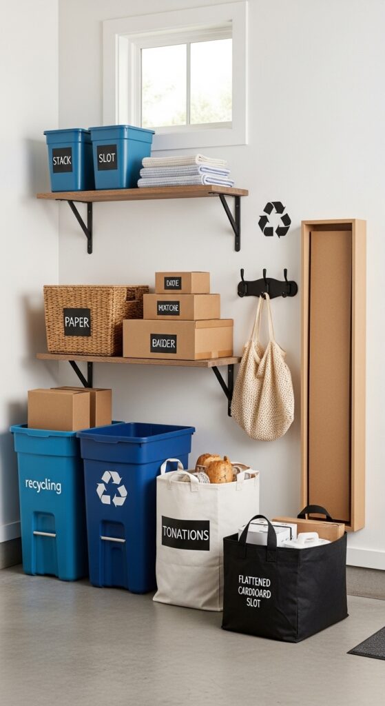 How to achieve it: Set up rolling bins for recycling, a handled tote for donations, and a vertical slot for flattened cardboard near the garage door. Use bold labels so everyone knows where to drop things.