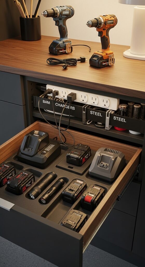 How to achieve it: Use a deep drawer or cabinet shelf with a mounted power strip and simple cable clips. Group chargers by brand and label outlets so batteries always return to the right spot.