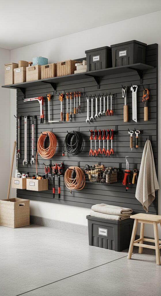 What makes it work: Slatwall creates clean vertical rhythm, so even practical items look deliberate instead of random. Matching hooks and bins keep visual clutter low while making tools easy to grab.