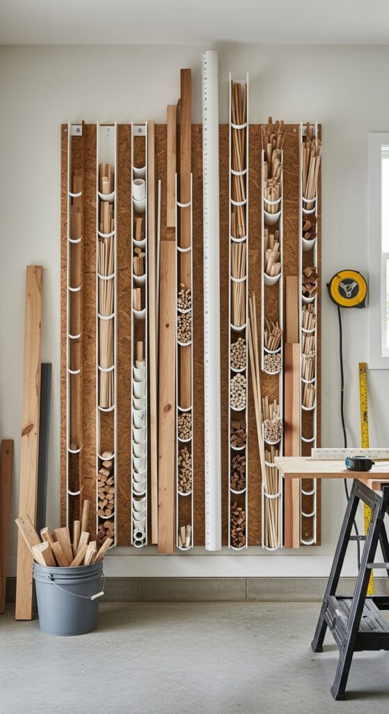 How to achieve it: Secure wide-diameter PVC sections to a plywood backer or wall studs and sort wood by type or project use. Keep the base raised slightly so sweeping underneath stays easy.