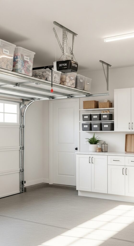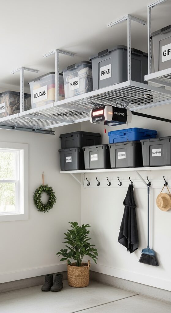 How to achieve it: Install steel ceiling racks above the garage door track or over the hood area, using clear or matching opaque totes with bold front labels. Reserve them for light, seasonal items such as wreaths, coolers, or gift wrap.