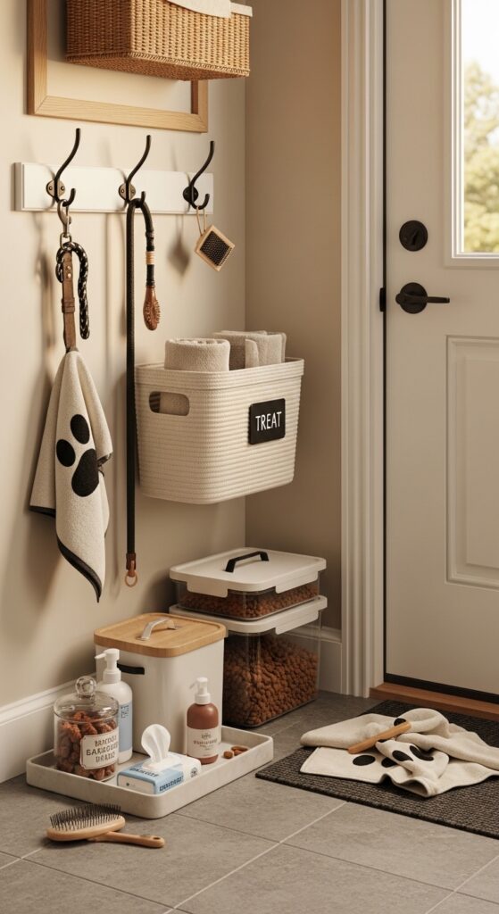 How to achieve it: Add two hooks, a lidded food bin, and a washable basket for towels or grooming tools. Keep a shallow tray below for wipes, paw cleaner, and spare waste-bag rolls.