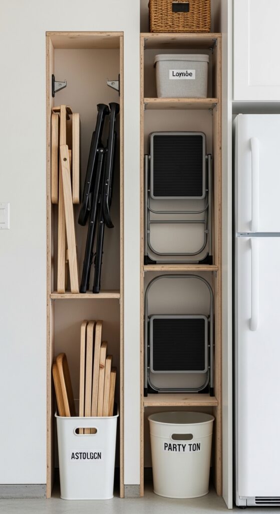 What makes it work: Folding chairs and stools are slim, but they become messy fast when they slide into corners. A narrow slot system creates just enough structure to hold them upright and visually quiet.