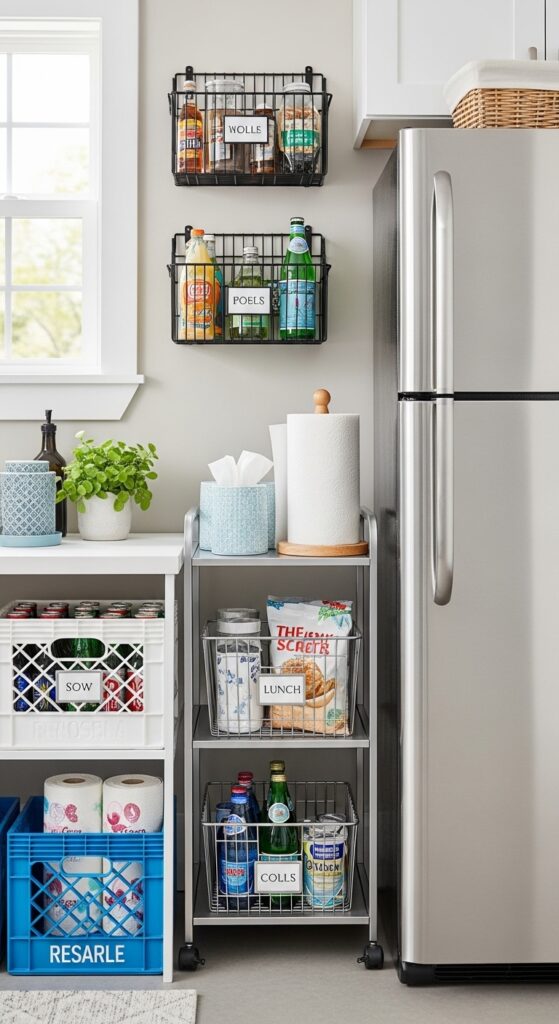 What makes it work: The narrow gap beside a garage fridge often goes wasted, yet it’s ideal for slim storage. A rolling cart keeps supplies accessible while preventing paper goods and snacks from piling on top of the appliance.