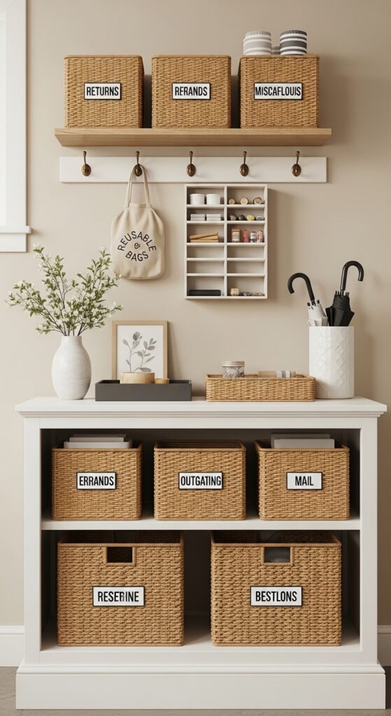 How to achieve it: Use an open shelf or short cabinet with labeled bins for returns, errands, outgoing mail, and “belongs upstairs.” Empty it once or twice a week so it stays a tool, not a hiding place.