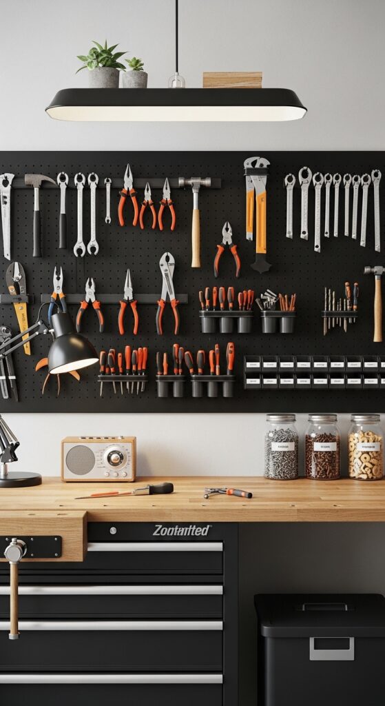 How to achieve it: Paint hardboard or metal pegboard black or deep gray for a more elevated look, then hang the tools you use weekly. Add small cups or magnetic trays for screws, blades, and drill bits.