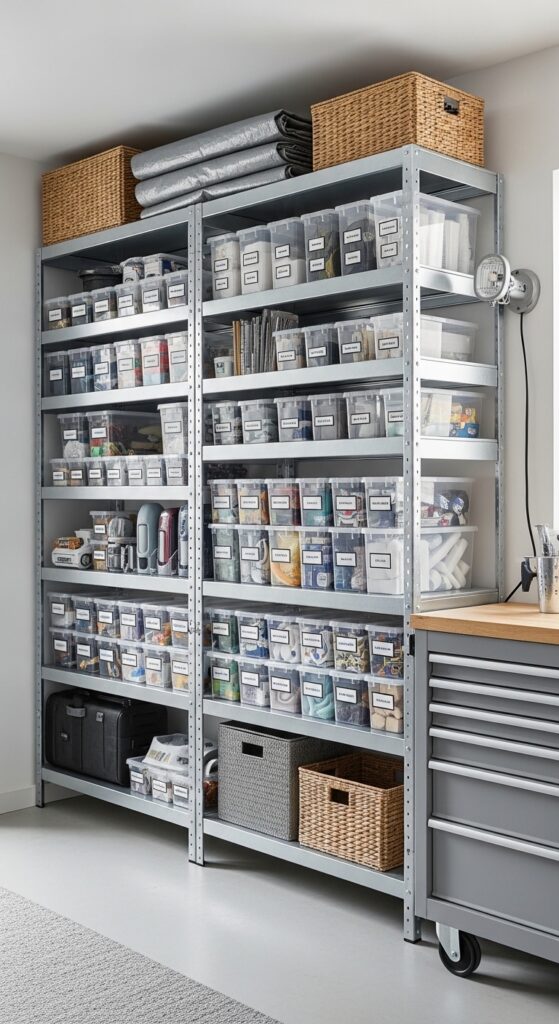 How to achieve it: Choose shelf units at least 18 to 24 inches deep and use stackable clear bins with front-facing labels. Store lighter items up high and everyday categories at chest height for quick access.
