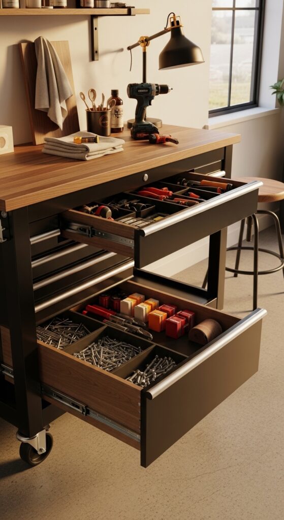 How to achieve it: Pick a workbench with locking casters and deep ball-bearing drawers, then assign one drawer each to fasteners, power-tool accessories, and sanding supplies. Add a rubber liner so tools stay quiet and organized.