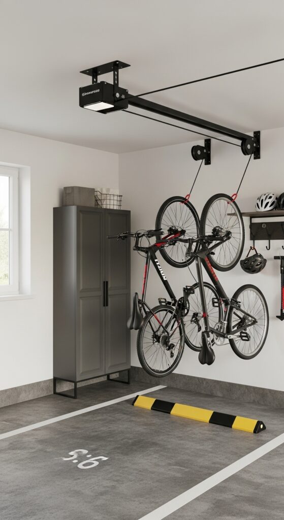 How to achieve it: Use a rated pulley kit mounted into ceiling joists, especially above side aisles rather than the main car path. Keep one wall hook nearby for helmets, locks, and pumps so the whole bike setup stays together.