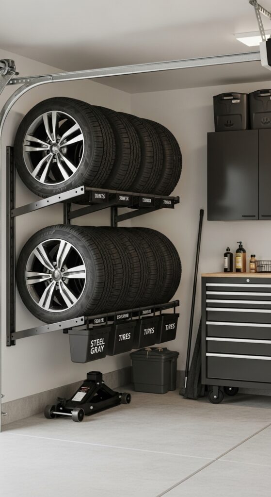 What makes it work: Tires are heavy and visually dense, so placing them at one consistent height prevents the garage from feeling bottom-heavy. A dedicated rack also protects the rubber and frees precious floor space.
