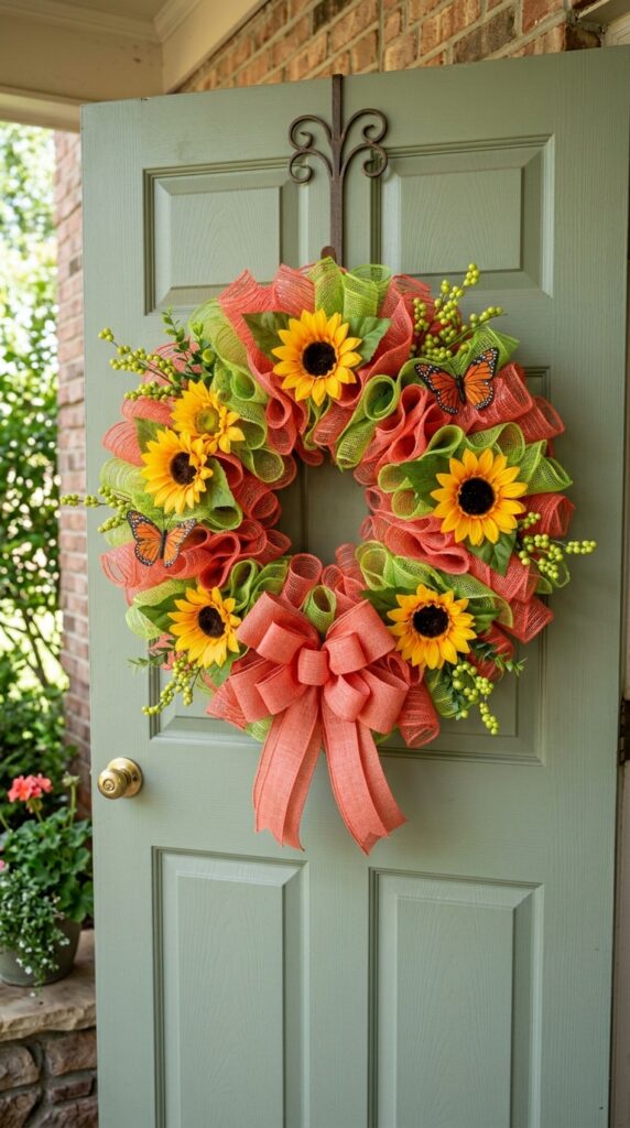 What makes it work: Deco mesh’s looped and ruffled texture catches light from multiple directions simultaneously, creating an almost pom-pom-like density that reads as lush and full even from a distance. Coral and lime is one of the most reliably energetic spring color combinations — complementary enough to vibrate slightly against each other, which makes the wreath feel alive.