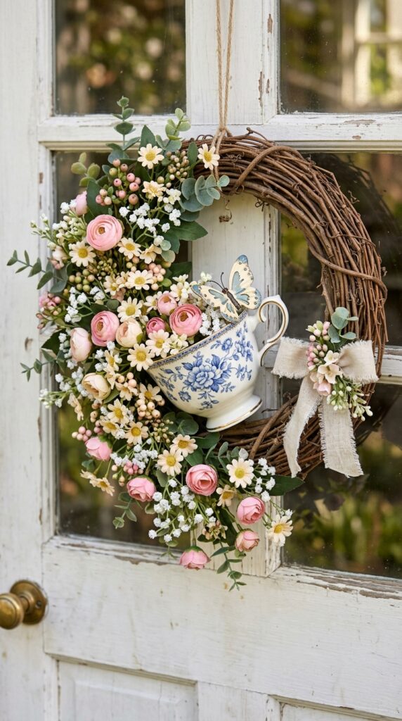 A wreath with a teacup overflowing with blooms is the most storybook thing you can create for a cottage-style front door — whimsical, specific, and completely unmistakable.