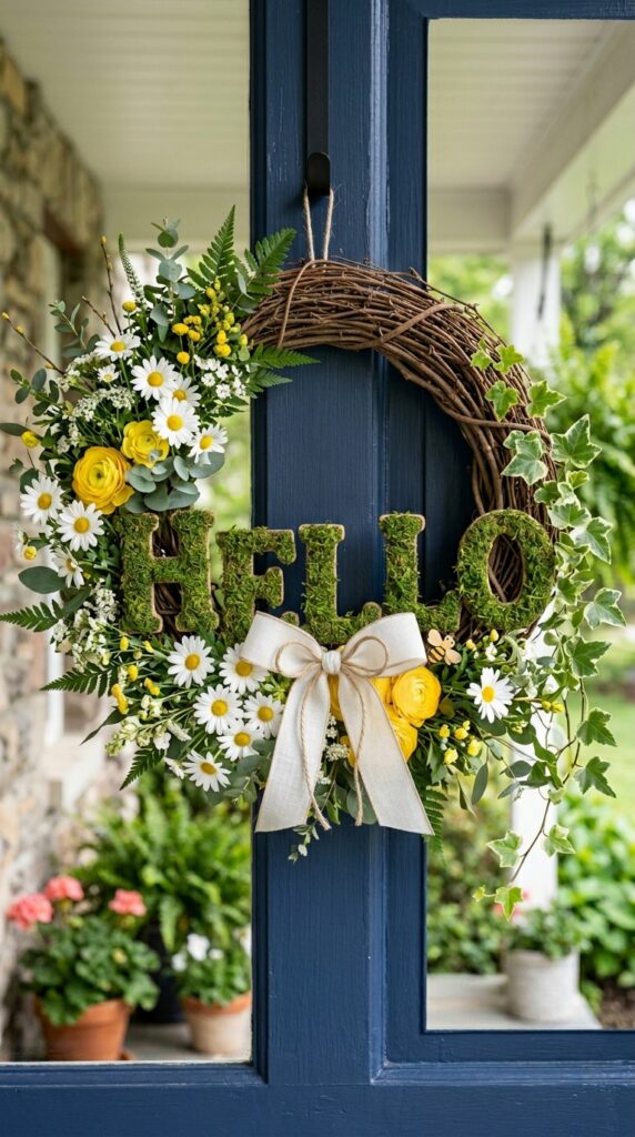 What makes it work: Adding a word to a wreath transforms it from decoration to communication — it gives the wreath a message and the home a personality. Moss-covered letters feel organic and hand-finished rather than commercial, and the word itself (“HELLO,” “BLOOM,” “SPRING,” or a family name) makes the wreath completely unique to the household.