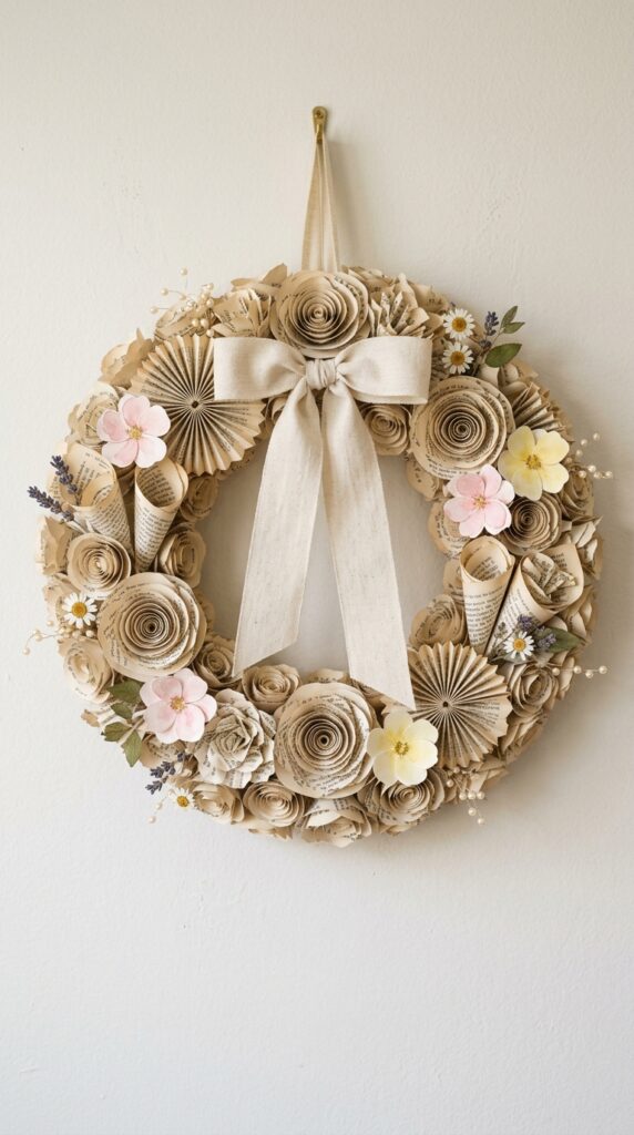 How to achieve it: Tear pages from an inexpensive vintage paperback (thrift stores sell them for $0.50) and roll half into tight paper roses by rolling diagonally from corner to corner, securing with hot glue. Fold the other half into accordion fans and pinch at the center for carnation-style flowers. Cover the entire wreath base before adding any painted paper accents.