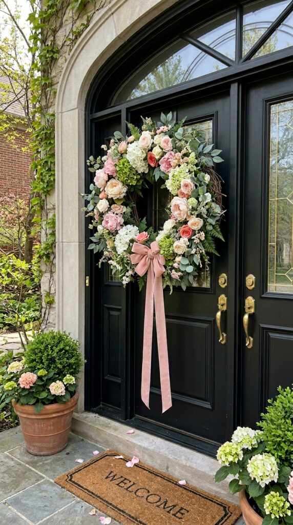 An oversized wreath is a commitment — and it pays off spectacularly. At 24 inches, a spring wreath stops being decoration and starts being architecture.
