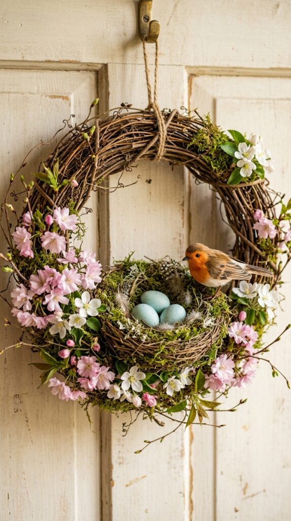How to achieve it: Purchase a small decorative bird’s nest and faux robin’s eggs from a craft store — these are widely available and inexpensive in spring. Secure the nest firmly to the wreath base using hot glue and floral wire threaded through the nest base. Tuck cherry blossom or apple blossom picks around the nest to frame it, and add a small faux bird on the nest edge for the full storybook effect.