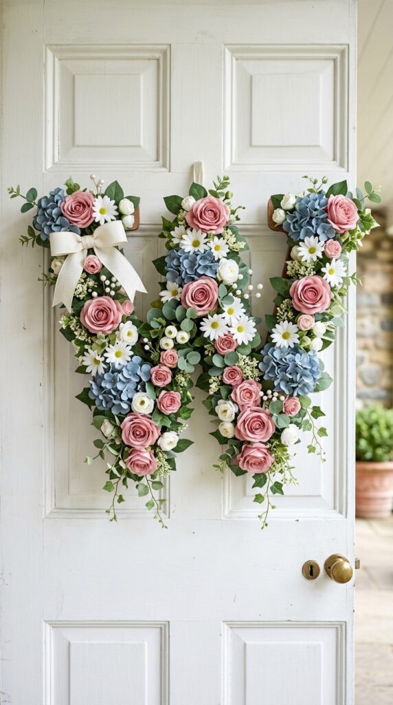 What makes it work: The letter form provides a clear silhouette that reads instantly from a distance — far more distinctive than a round wreath at first glance. The blooms add softness to what would otherwise be a graphic shape, balancing personal with beautiful. It works especially well in spring because the density and variety of spring blooms fills the letter form without looking thin.