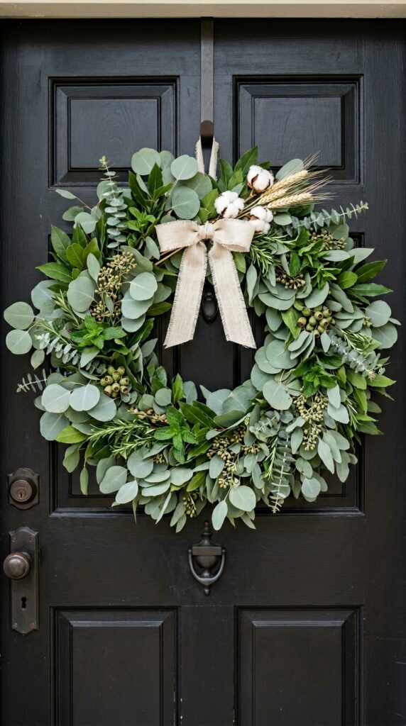 How to achieve it: Wire or rubber-band bundles of mixed eucalyptus varieties onto a wire ring base, alternating varieties as you work around the ring. Add fresh mint or rosemary for contrasting leaf texture and a beautiful fragrance. Spray lightly with water every few days if using fresh eucalyptus — it will dry in place beautifully over two to three weeks.