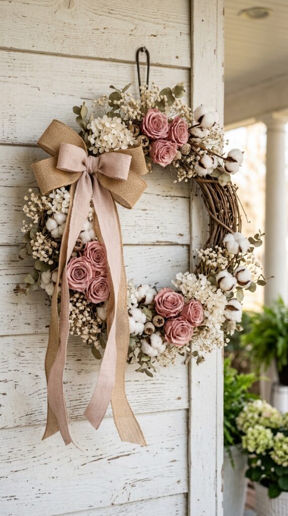 What makes it work: Cotton bolls provide a textural contrast to rose petals that is deeply satisfying — the fluffy, three-dimensional cotton against the layered, smooth-edged petals creates the kind of tactile richness that makes people reach out to touch a wreath. Preserved roses (rather than faux) have a realistic softness and slight color variation that elevates the whole composition.