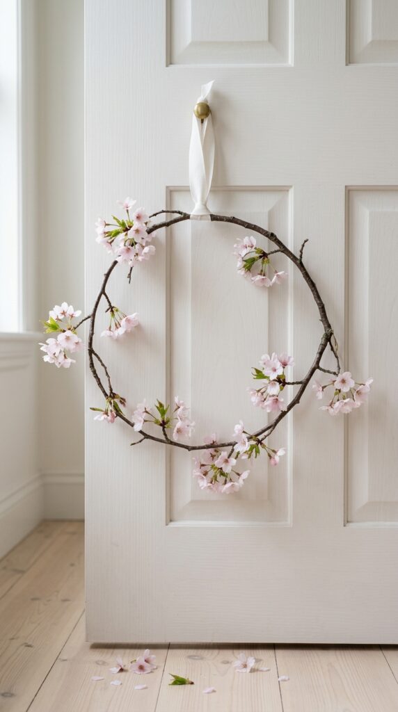 A single cherry blossom branch shaped into a loose circle is the most minimal and architectural wreath on this list — and in its restraint, it’s also one of the most striking.