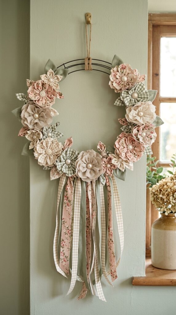 What makes it work: Fabric flowers have a warmth and tactility that faux plastic florals can’t match — the weave and drape of cotton and linen feel genuinely domestic and handmade in a way that reads as intentional and skilled. Mixing two to three complementary fabric prints (a floral, a stripe, a solid) within the same wreath creates visual complexity without color chaos.