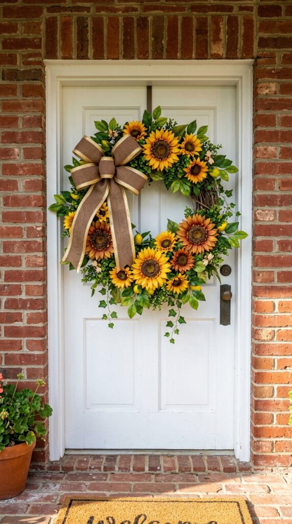 Sunflowers on a front door radiate a welcome that is almost unreasonably cheerful — bold, warm, and instantly mood-lifting for anyone who approaches.