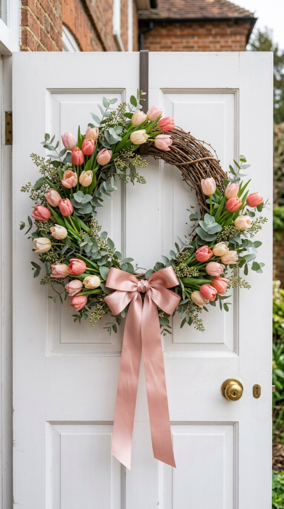 How to achieve it: Use a 14–16 inch grapevine wreath base and floral wire to secure bundles of faux or fresh tulip stems in clusters around the ring. Alternate blossom heights within each cluster for a natural silhouette, and tuck eucalyptus or seeded greenery between clusters to fill negative space without flattening the composition.