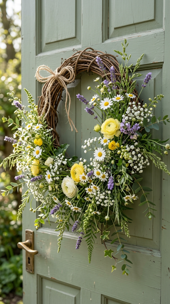 How to achieve it: Start with a grapevine or straw base and work with floral picks rather than pre-cut stems — the longer the stem, the more freedom you have to angle and extend each bloom beyond the edge. Mix at least five different flower types in varied scales: one large focal flower (ranunculus), two medium fillers (daisies, chamomile), and two airy elements (baby’s breath, lavender).