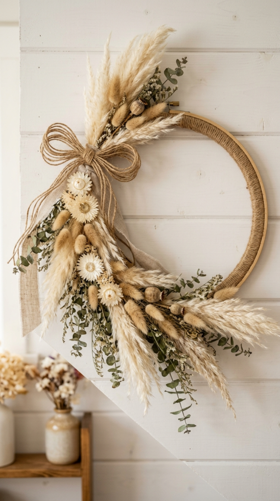 How to achieve it: Use an embroidery hoop wrapped in jute twine as the base — it’s lighter and more architecturally interesting than a grapevine ring for this style. Glue or wire pampas plumes first as the largest element, then fill with bunny tails and dried florals. Arrange everything to one side or cluster at the bottom for an asymmetric, editorial composition.