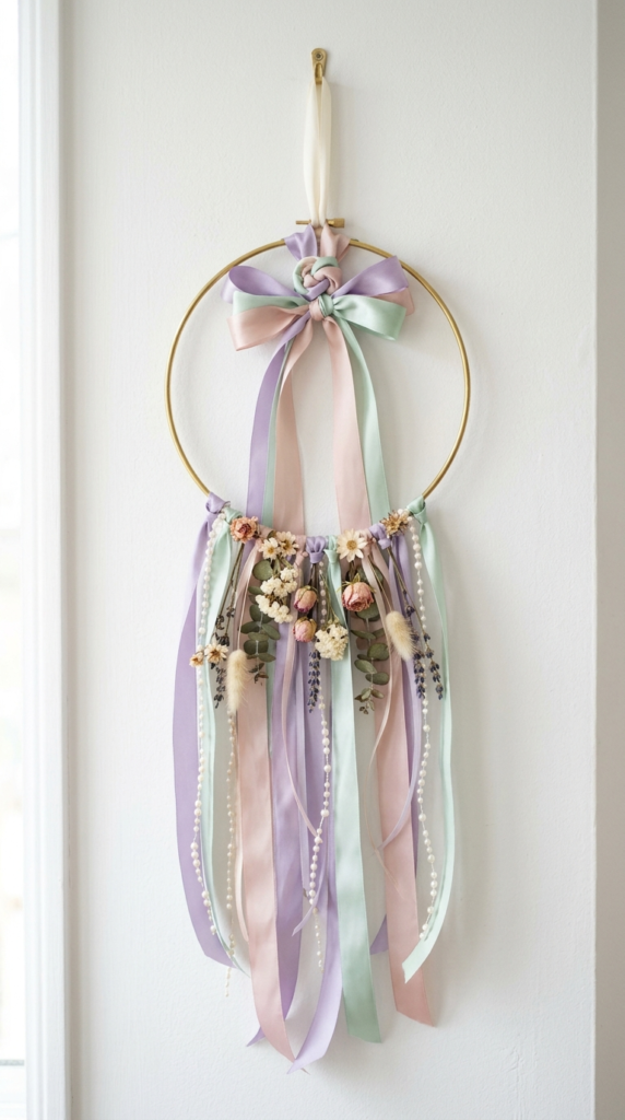 How to achieve it: Use a 10–14 inch brass embroidery hoop and cut ribbons in three to five complementary pastel tones at varying lengths — the longest should reach about 18 inches below the hoop. Tie them in simple knots at the top arc of the hoop and tuck dried flower heads into the knot junctions with a small dab of hot glue. The whole project takes under 20 minutes.