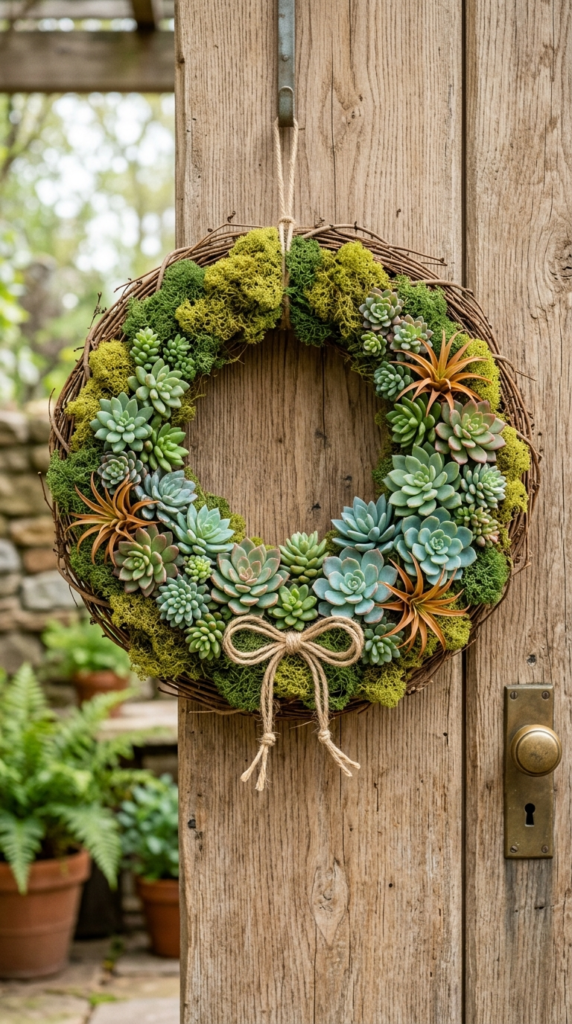 A succulent and moss wreath is the choice for people who love the idea of spring gardening translated directly onto a front door — earthy, textural, and unlike anything you can buy.