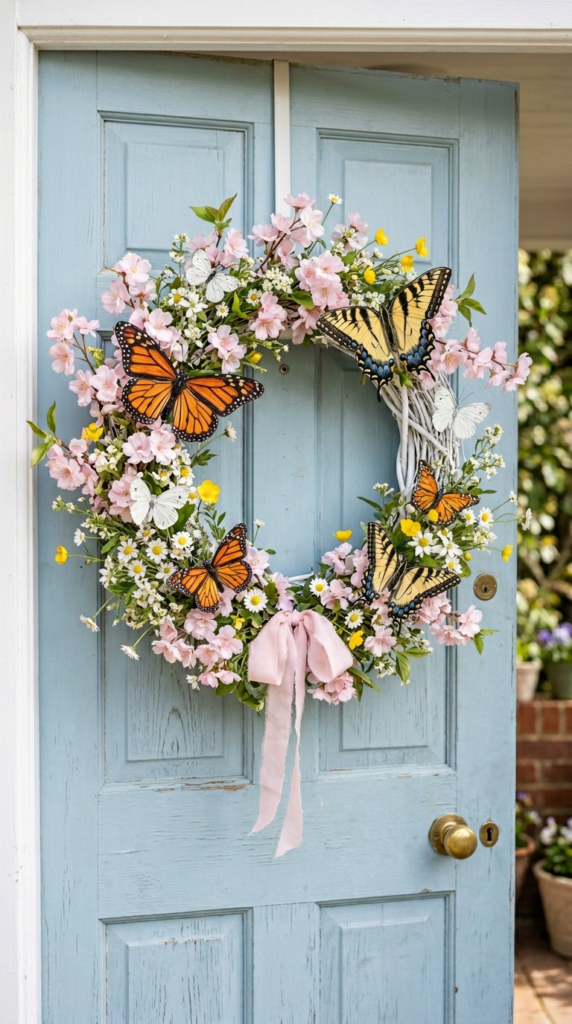 A butterfly wreath with wildflowers taps into something genuinely childlike and joyful — it looks like spring arrived, landed, and decided to stay.