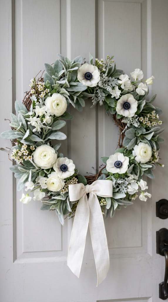What makes it work: Lamb’s ear’s silvery, velvet-textured leaves provide a completely different visual quality from the typical glossy or matte greens used in wreaths — they catch light in a uniquely soft, almost luminous way that elevates everything placed against them. All-white flowers against this silver-green base look couture rather than simply pretty.