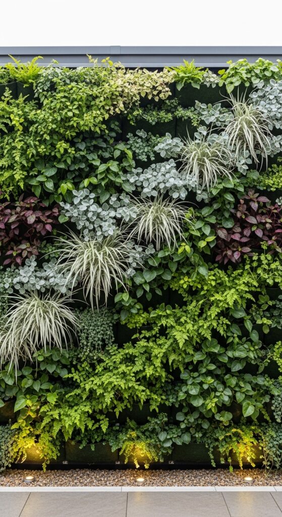 What makes it work: Living walls solve the privacy challenge in urban settings where ground-level planting space is limited — they deliver maximum green coverage and air-quality benefits in a minimal footprint. The textural variety of different plant species across the wall surface creates a complexity and depth that no single material can match.