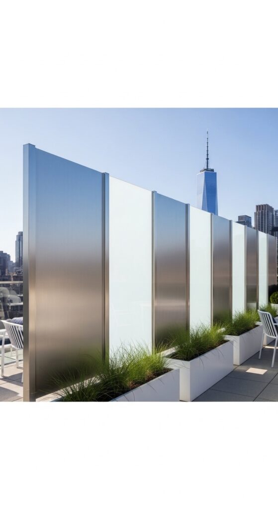 What makes it work: The alternation between opaque steel and translucent frosted glass creates a pattern of light and shadow that shifts throughout the day — steel panels glow warm gold at dusk, while frosted glass panels glow luminous white at midday. The combination gives you genuine privacy while maintaining a sense of lightness that solid walls lack.
