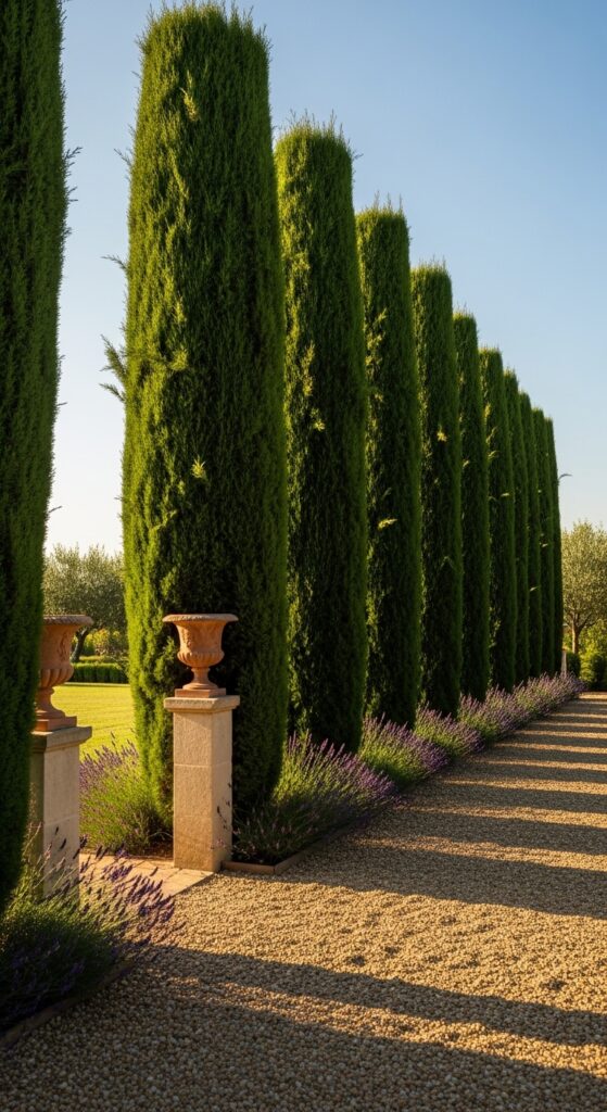 What makes it work: Italian cypress trees achieve something no built structure can — a living privacy wall that grows more beautiful and more effective with every passing year, while simultaneously providing habitat, cooling, and sound absorption. The tight columnar form means they take up minimal ground footprint while delivering maximum vertical coverage.
