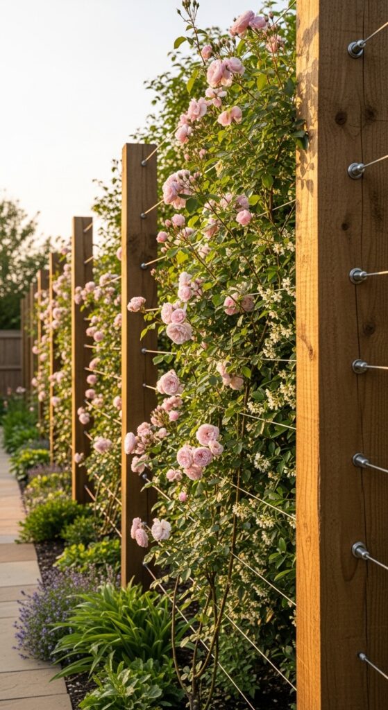 How to achieve it: Tension wires using vine eye bolts with built-in tensioners — tighten annually as the wire stretches. For climbing roses specifically, choose repeat-flowering, disease-resistant varieties such as Rosa ‘New Dawn’ or ‘Cecile Brunner,’ which provide maximum coverage. Train new shoots horizontally along the wires rather than upward to encourage maximum flower production.