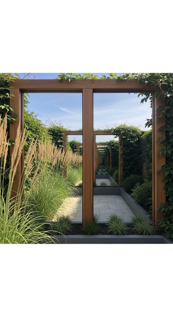 How to achieve it: Use only mirror glass specifically manufactured for outdoor use — standard interior mirror silvering corrodes and develops black edge spots within months when exposed to moisture. Frame in powder-coated aluminum or hardwood for weather resistance. Position mirrors to reflect garden planting rather than the viewer’s face for the most convincing garden-extension illusion.